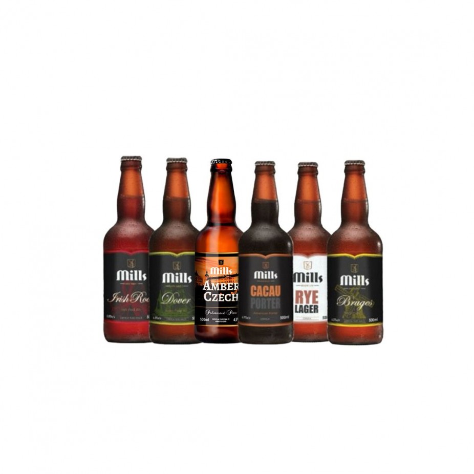 Pack Clássicos Mills é composto por 6 garrafas de 500 ml: 01 Lager, 01 Amber Czech, 01 Bruges, 01 Irish Roots, 01 Dover, 01 Cacau Porter
